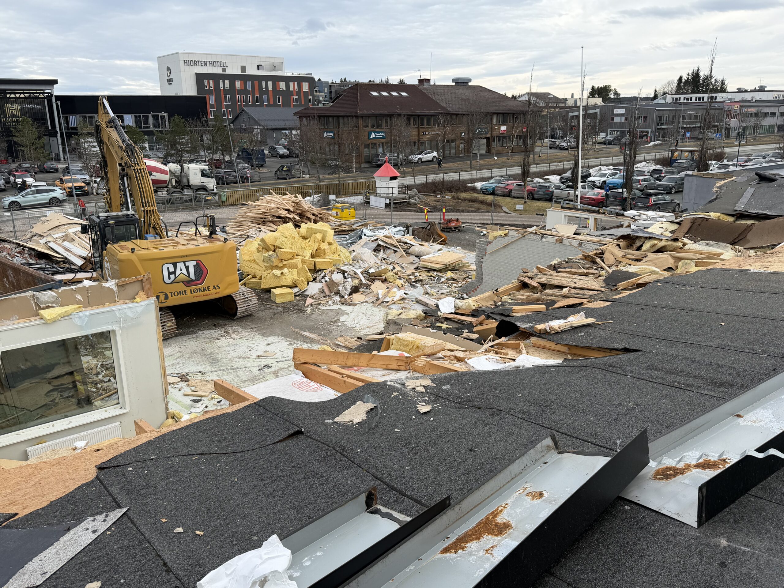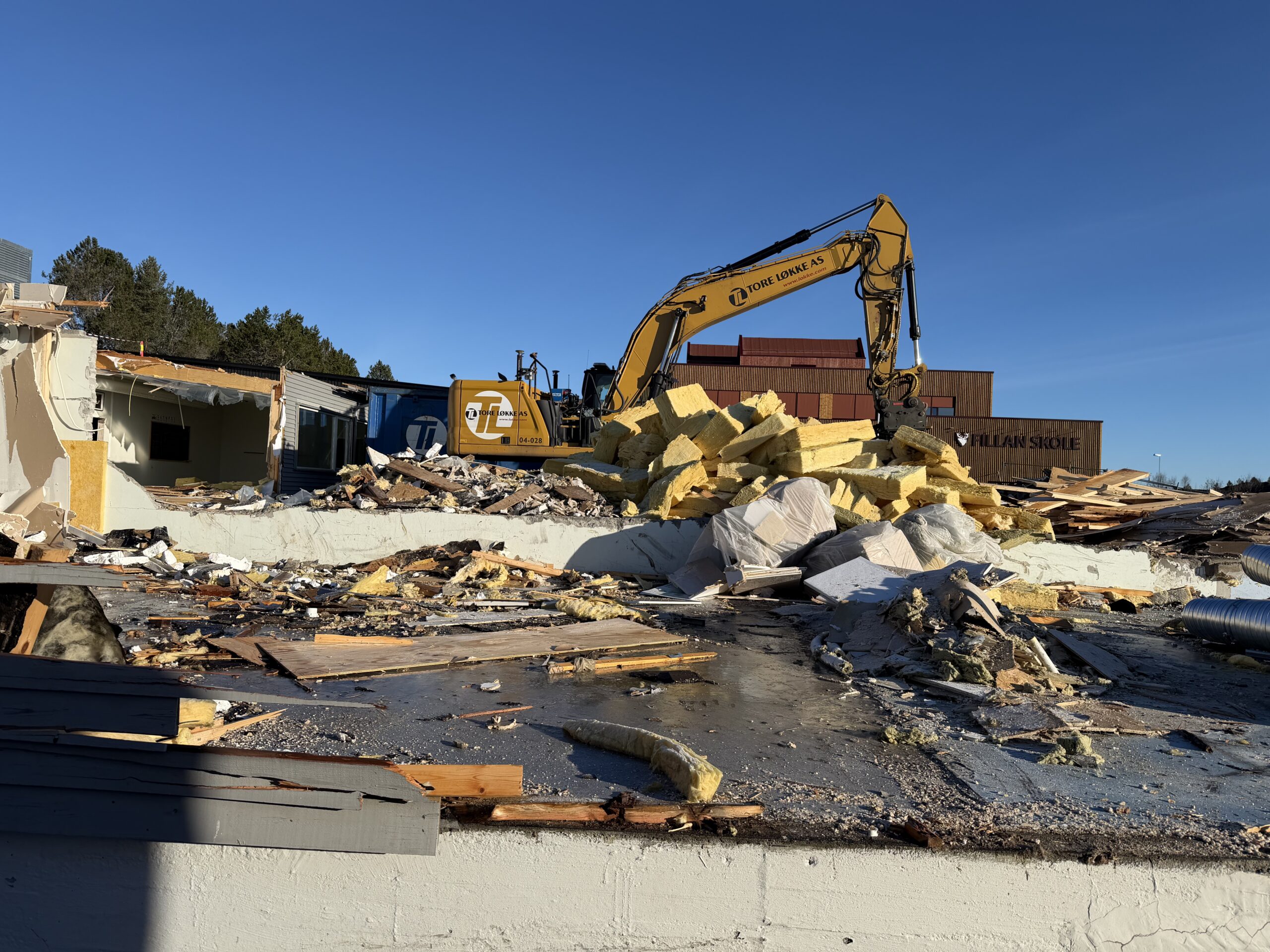 Borte ved gammelskolen pågår nå rivearbeidene for fullt. Dette er en anstendig prosess, hvor rivematerialene separeres fra hverandre før de sorteres i konteinere som sendes til gjenvinning. Deler av arbeidet må gjøres for hånd, og deler kan utføres med maskiner.